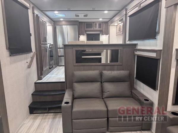 Enjoy each and every vacation, month-long trips, or even extended stays at an RV park in this spacious fifth wheel! The raise rear kitchen gives the cook plenty of room to whip up any type of meal using the stainless steel appliances including a 24" residential oven, an oversized pantry, and the raised bar top will provide you even more counter space on top of dining with two chairs that overlook the middle living area. Relaxing is made easy thanks to two tri-fold sofas and theatre seating while watching the big game on the LED Smart TV and enjoying the fireplace below. Dual sinks in the full bathroom allow two people to easily get ready at once, and the flip up teak seat in the shower is a nice convenience. At night, retire to your own King bed which slides out to provide more floor space, and enjoy a show on the LED TV above the flip-top dresser once in bed.