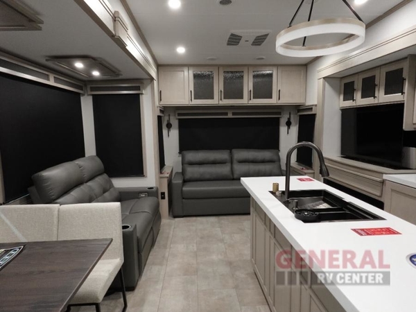 Each Solitude fifth wheel by Grand Design features a 101" wide-body construction, heavy duty 8,000 lb. axles, frameless tinted windows, and high-gloss gel coat sidewalls. You can camp year around thanks to the Weather-Tek Package that includes a 35K BTU high-capacity furnace, an all-in-one enclosed and heated utility center, and a fully enclosed underbelly with heated tanks and storage. Inside, you'll love the premium roller shades, hardwood cabinet doors, solid surface countertops, plus residential finishes throughout to make you truly feel at home. Each model also includes a MORryde CRE3000 suspension system, self adjusting brakes, and a MORryde pin box that will provide smooth towing from home to campground. Affordable luxury is possible with the Solitude fifth wheels; choose yours today!