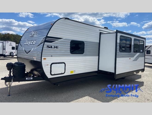 The Jayco Jay Flight SLX travel trailer is quite easy to own because it is lightweight for an easier towing experience. Built on a fully integrated A-frame with galvanized-steel, impact-resistant wheel wells, the Jay Flight SLX has quality at its very foundation. That quality continues on to the electric self-adjusting brakes, easy-lube hubs, Magnum Truss roof system, and LP quick connect. Some of what the mandatory Customer Value Package includes is backup camera prep, Keyed-Alike entry and baggage doors, and an on-demand tankless water heater.