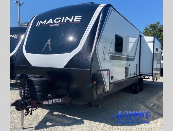 This Imagine travel trailer has opposing slides to provide you with ample living space on the interior once you've parked and set up! You can use the tri-fold sofa and theater seating to relax, and the booth dinette is another seating space that you can use for dinner time or game nights. The entertainment center has a LED HDTV with fireplace below, which is great for movie night. When outside, you will love the two power awnings to sit beneath to keep you protected from the sun while you have fun at your campsite. The exterior also offers you an LP quick connect and a coax TV hookup.