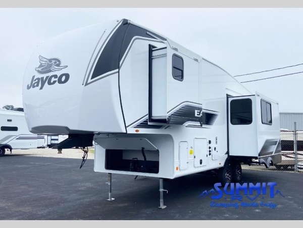With any Eagle SLE fifth wheel by Jayco, you will enjoy a lighter tow weight, high-end finishes, and the same quality construction you've come to expect from Jayco! There is an Alpha Ply TPO roof membrane, a fully enclosed and heated underbelly, plus Stronghold VBL walls for added durability. There is also a rear 2" towing receiver outside, along with metal slam latch baggage doors, MORryde Step Above entry steps, and a Winegard Air 360 antenna with router prep if you want to stay connected as you camp. Once inside you'll enjoy the handcrafted and glazed door/drawer fronts, blackout pleated shades throughout, and residential vinyl flooring throughout with no carpet for an easier clean. The on-demand water heater, 30K BTU furnace, and 15K BTU "Whisper Quiet" A/C will ensure your comfort year around, and the optional Overland 1 Solar Package can be added if you need off-grid capabilities!