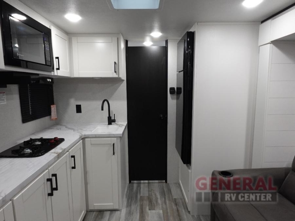 This single-axle couple's travel trailer is sure to bring you happiness at the campground. There is a front queen bed with a privacy curtain if you have a guest staying over on the jack-knife sofa, and the movable table in front of the sofa will provide more floor space when needed. A cooktop and microwave oven will let you make meals each day, and an 8 cu. ft. 12V refrigerator will be perfect for perishables. This model also includes a full rear bath with a tub/shower, a toilet, plus a sink and a linen closet for clean towels.