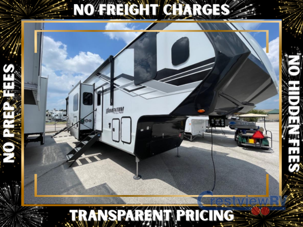 With any Momentum M-Class toy hauler by Grand Design, you will enjoy luxury at every turn! They have been constructed to a superior standard with a thermal roof design, triple insulated main floor and garage floor, and a Rail-Tite underbelly seal that will allow you to camp in all elements. Each model also features an 8' 5" wide body chassis with a wide rail design, no wheel wheels, and a dovetail entry for easier loading. The Stealth A/C system provides maximum cooling power, and the CRE3000 suspension system means you can enjoy a smooth tow each time. You will love the luxurious interior with a professional grade stainless steel cooktop, interior color changing LED accent lighting, a fiberglass shower with a glass door, and solid surface countertops.