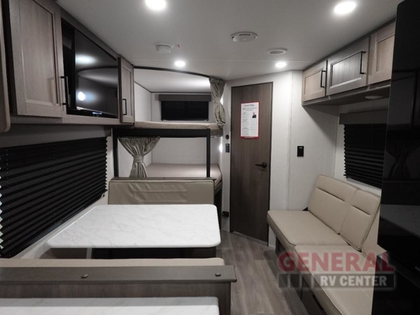 This is the perfect travel trailer if you like to camp with friends and family. Since there are double-size bunks, a queen bed in the front bedroom, plus a booth dinette and sofa, you can sleep eight campers each night! The three burner range and microwave in the kitchen will let you cook meals each day, and the 12V refrigerator will keep your cold items fresh. This model also includes a counter with extra storage underneath, a pull-out trash can storage for convenience, and a full bath to freshen up in each day. And you'll love having your own space in the front bedroom with a privacy curtain, dual wardrobes, and TV prep if you want to add a television!