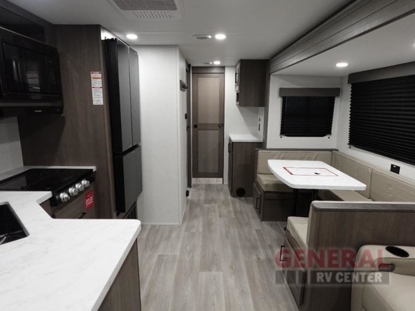If you're looking for a travel trailer that can house your whole gang, this unit is the one! The rear private bunkhouse can sleep up to five since there is a sleeper sofa and three bunks, plus there are storage drawers for your guests' things. A front private bedroom will be perfect for the owners with a queen bed, storage space, and a convenient laundry chute! Whether you cook outside on the exterior griddle or inside on the three burner range, you'll be able to make your best meals. There is also a 12V French door refrigerator with a glass front and bottom freezer and a convection microwave/combo air fryer for easy meals!