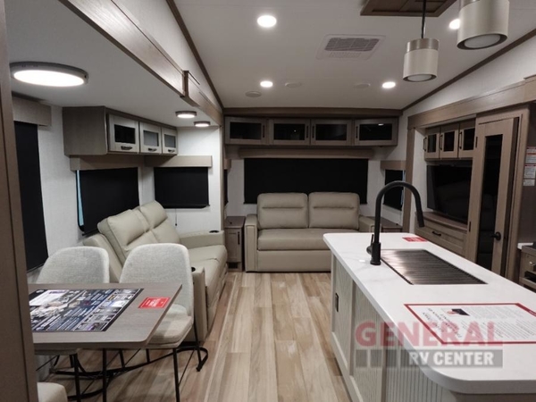 You can enjoy a spacious rear living area in this RV with dual opposing slides offering you entertainment, kitchen amenities, seating and windows for great views! The rear tri-fold sofa also converts into extra sleeping space for an extra guest or two. There are theater seats to enjoy while you place your drinks in the cupholders and watch the entertainment center with a 40" LED HDTV and fireplace. The pantry is big enough to store your favorite snacks, and the kitchen island will make meal prepping easier, plus there is a 16 cu. ft. refrigerator to store any leftovers. The full bathroom has a 30" x 48" fiberglass shower and a linen closet to store your towels.