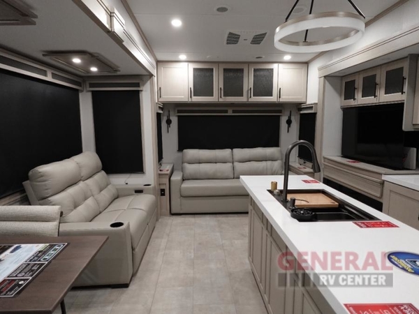 Are you looking to upgrade from a travel trailer to a fifth wheel? If so, this model will be perfect for you! Once you arrive at the campground, you can unload your gear from the pass-through storage, put out the two power awnings, then relax with a cold drink. Inside, you can kick your feet up on the theater seating, play a game at the free-standing dinette, or relax on the tri-fold sofa. The chef of your group will have a kitchen island with a Smart sink, plus a spacious 20 cu. ft. 12V refrigerator. There is also a built-in oven, plus a pantry and a hutch for storage galore! Having two bath sinks in the full bath is sure to be a big convenience when getting ready for bed, and the bed slide out in the front bedroom will provide a great night's rest. You will also find a front wardrobe, a slide top dresser, plus washer/dryer prep!