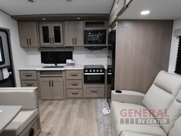 This rear kitchen fifth wheel is sure to meet all of your camping needs! Since the exterior length is only 26' 11", you can easily maneuver in and out of campgrounds. The rear kitchen includes ample counter space to prep meals, a three burner cooktop, and overhead storage for all your necessities. There is a 10 cu. ft. 12V refrigerator within the slide out that also includes the theater seating, and the U-shaped dinette provides a place to dine or play a card game. You will appreciate having convenient storage by the entry door, along with pull-out pet bowls, a functional wardrobe closet in the bedroom and an exterior pass-thru for belongings and camping gear.