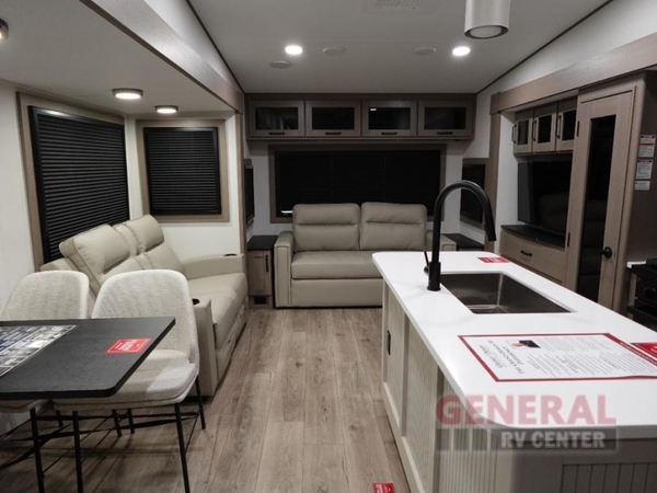 You can enjoy a spacious rear living area in this RV with dual opposing slides offering you entertainment, kitchen amenities, seating and windows for great views! The rear tri-fold sofa also converts into extra sleeping space for an extra guest or two. There are theater seats to enjoy while you place your drinks in the cupholders and watch the entertainment center with a 40" LED HDTV and fireplace. The pantry is big enough to store your favorite snacks, and the kitchen island will make meal prepping easier, plus there is a 16 cu. ft. refrigerator to store any leftovers. The full bathroom has a 30" x 48" fiberglass shower and a linen closet to store your towels.