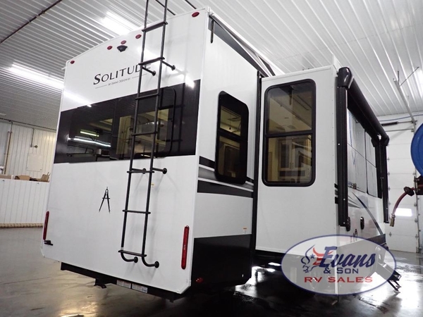 Each Solitude fifth wheel by Grand Design features a 101" wide-body construction, heavy duty 8,000 lb. axles, frameless tinted windows, and high-gloss gel coat sidewalls. You can camp year around thanks to the Weather-Tek Package that includes a 35K BTU high-capacity furnace, an all-in-one enclosed and heated utility center, and a fully enclosed underbelly with heated tanks and storage. Inside, you'll love the premium roller shades, hardwood cabinet doors, solid surface countertops, plus residential finishes throughout to make you truly feel at home. Each model also includes a MORryde CRE3000 suspension system, self adjusting brakes, and a MORryde pin box that will provide smooth towing from home to campground. Affordable luxury is possible with the Solitude fifth wheels; choose yours today!