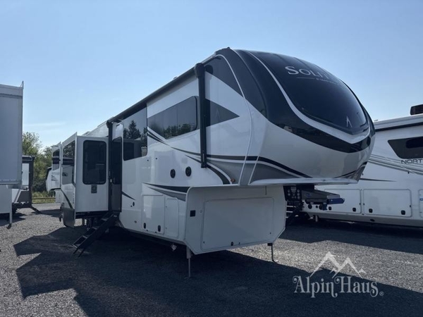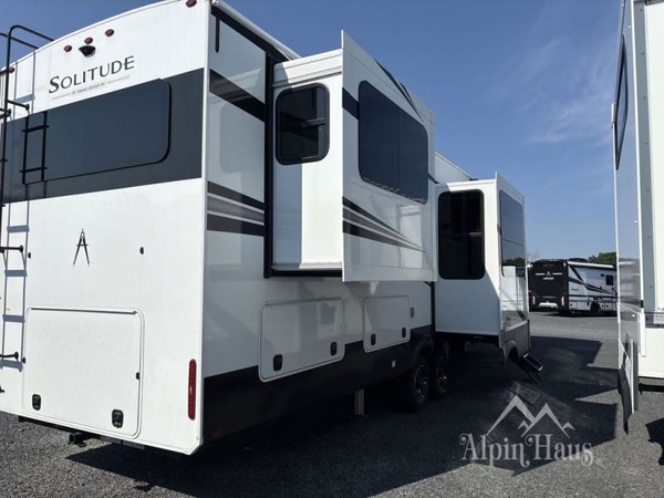 Each Solitude fifth wheel by Grand Design features a 101" wide-body construction, heavy duty 8,000 lb. axles, frameless tinted windows, and high-gloss gel coat sidewalls. You can camp year around thanks to the Weather-Tek Package that includes a 35K BTU high-capacity furnace, an all-in-one enclosed and heated utility center, and a fully enclosed underbelly with heated tanks and storage. Inside, you'll love the premium roller shades, hardwood cabinet doors, solid surface countertops, plus residential finishes throughout to make you truly feel at home. Each model also includes a MORryde CRE3000 suspension system, self adjusting brakes, and a MORryde pin box that will provide smooth towing from home to campground. Affordable luxury is possible with the Solitude fifth wheels; choose yours today!
