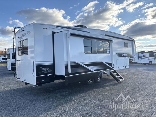 With any Eagle fifth wheel by Jayco you will appreciate durable construction materials, like the Magnum Truss Roof and the Stronghold VBL laminated walls. The JAYCOMMAND Smart RV system puts you in control of your RV's functions, and the 5 Star Handling Package will provide smooth towing from home to camp. Each model features Climate Shield zero-degree tested weather protection and the industry-exclusive HELIX cooling system that features two 15,000 BTU Whisper Quiet A/C's to keep you comfortable year around. Some of the exterior conveniences you are sure to love are the pass-through storage with Slam-Latch baggage doors and an automotive style front cap with max turn radius. The Eagle fifth wheels are designed to make you feel at home with solid hardwood slide fascia, residential vinyl flooring throughout, 100% no floor vents, and blackout roller shades with reflective side throughout for added privacy and insulation.
