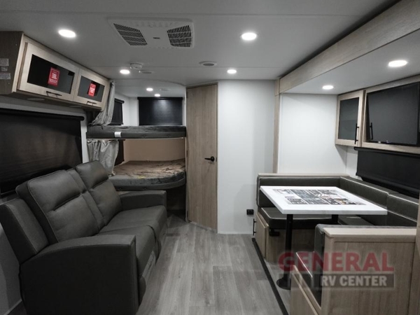 The dual entry doors make it easy to enter and exit this travel trailer! You will find a walk-around queen-size bed up front in the private bedroom, and one of the entry/exit doors to the unit so you can quietly slip out for an early morning fishing trip. The U-shaped dinette is right next to the window, so you can look out at your surroundings while you enjoy breakfast. The double-size bunks have some privacy curtains, and the bunks are right next to the full bathroom for easy access in the middle of the night. The fully equipped kitchen has everything you need to get dinner in the oven, and you can have some more prep space by using the flip-up countertop extension. You even have an outdoor griddle and an outdoor 1.6 cu. ft. refrigerator to enjoy a cold beverage while you cook under the 22' electric awning!