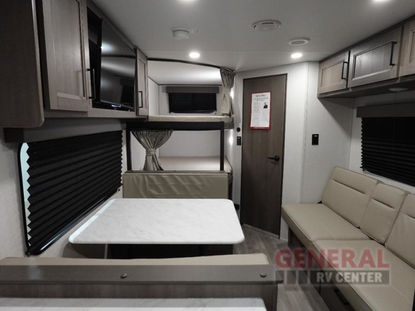 This is the perfect travel trailer if you like to camp with friends and family. Since there are double-size bunks, a queen bed in the front bedroom, plus a booth dinette and sofa, you can sleep eight campers each night! The three burner range and microwave in the kitchen will let you cook meals each day, and the 12V refrigerator will keep your cold items fresh. This model also includes a counter with extra storage underneath, a pull-out trash can storage for convenience, and a full bath to freshen up in each day. And you'll love having your own space in the front bedroom with a privacy curtain, dual wardrobes, and TV prep if you want to add a television!