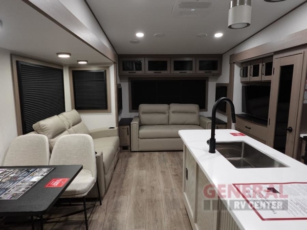 You can enjoy a spacious rear living area in this RV with dual opposing slides offering you entertainment, kitchen amenities, seating and windows for great views! The rear tri-fold sofa also converts into extra sleeping space for an extra guest or two, just like the booth dinette does. Yet you might like to add the swivel dinette option. There are theater seats to enjoy while you place your drinks in the cupholders and watch the entertainment center with a 40" LED HDTV and fireplace. The pantry is big enough to store your favorite snacks, and the kitchen island will make meal prepping easier, plus there is a 16 cu. ft. refrigerator to store any leftovers. The full bathroom has a 30" x 48" fiberglass shower and a linen closet to store your towels. The front private bedroom has a comfortable king bed slide, a dresser with overhead cabinets, and a full wall wardrobe that is prepped to add a washer and dryer so that you can extend your camping trip with clean clothes!