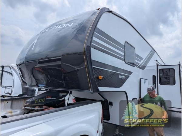 With any Reflection 150 Series fifth wheel by Grand Design, there is more available payload capacity and a broader range of half-ton trucks capable of towing this fifth wheel, and no slider hitch is needed thanks to the 90-degree turning radius which makes them short bed friendly and easier to tow. The mandatory Ultimate Power package provides a "One-Touch" automatic leveling system and a detachable power cord with LED light for easy setup, plus motion sensor pass-through lighting and entry lighting, and the Tire Linc TPMS will help you stay safe on the road. The interior offers residential luxury from the cabinetry and premium Congoleum flooring, to the booth dinette and residential-style window treatment. Make your refined decision today!
