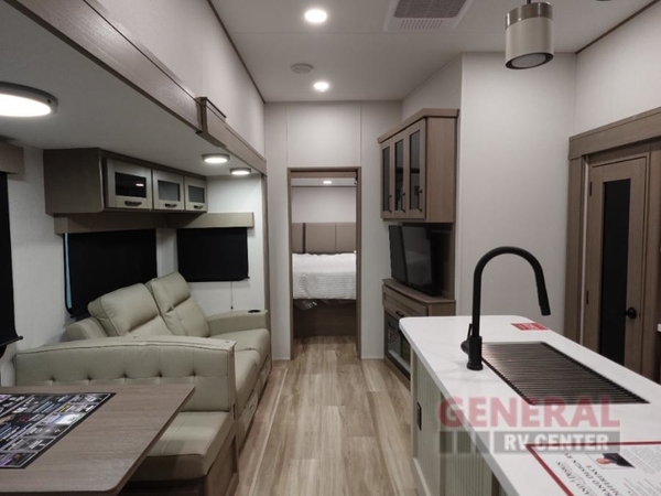 There is a whole lot to love about this fifth wheel! The front private bedroom has a queen bed to lay your head on at night, a slide with drawers and a linen closet, and even an entrance into the dual entry bathroom. The second private bedroom has a 54" x 74" top bed above a queen bed, a slide with a closet and drawers, and its very own half bathroom. The chef will have an easy time preparing delicious home cooked meals with the kitchen island, plus there is an outside kitchen complete with a 4.1 cu. ft. refrigerator to enjoy a cold beverage while you grill on the griddle. Enjoy a relaxing evening indoors either playing games at the booth dinette or on the theater seating across from the entertainment center with a fireplace and 40" TV.