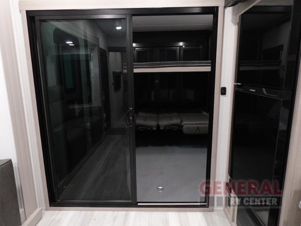 Start your engines for a fun weekend with your toys and your family in this Momentum G-Class toy hauler. The 11' separate garage includes Happi-Jac rollover sofas with a table and an optional top bed, plus a flip-up pet dish for your furry friends! There is even a second entry door which leads directly into the garage so that you don't have to walk through the entire trailer just to get to your cargo. In the front of this unit, you will have your own master suite that has private access to the residential walk-in shower in the dual-entry bathroom. The main living and kitchen area offers everything you need and would want, including theater seating and a TV with storage above the refrigerator!