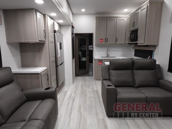 A 14' separate garage in this toy hauler offers plenty of space for your off-road toys! You will appreciate the convenience of having a full bathroom with a walk-in shower and you can even add an optional half bath to the garage area. You will also appreciate the two entry doors, and flip-up pet dish. The rear ramp door can even be converted into a patio, plus there are exterior speakers to keep the party going. Everyone will love hanging out in the separate living area with a fireplace at the entertainment center, two theater seating slides, and a third theater seating. The fully equipped kitchen has everything you need to prepare delicious home cooked meals. The front private bedroom offers an escape to rest and relax on a queen bed for the next ride!
