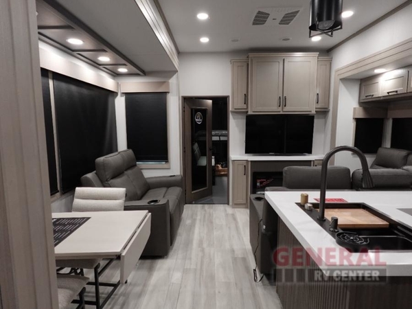 You want a toy hauler to carry your toys to the trails, and include many at-home comforts, and that's just what this unit delivers. A 14' separate garage includes an adjustable tie-down system, an optional Lifesuite System for more sleeping space, an optional half bath, plus washer and dryer prep. There is an overhead loft bed and an L-shaped sofa with recline in the main living area that offers sleeping space as well. Everyone can watch a movie on the LED TV with a fireplace below while sitting on the sofa, in the theatre seats, or while at the free standing dinette with four chairs. The chef will have upgraded appliances to make meals for everyone, an L-shaped countertop with a kitchen sink, and a USB charging outlet. You will love the shower with seat in the full bathroom with two space savings sliding doors that lead into the hallway, and into the front bedroom where you will have a walk-around queen bed, a slide out wardrobe and more USB charging outlets.