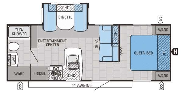 The living and kitchen areas offer a sofa, dinette slide, entertainment center, double kitchen sink, three burner range, microwave, and refrigerator.