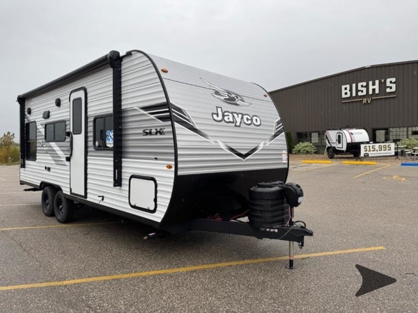 The Jayco Jay Flight SLX travel trailer is quite easy to own because it is lightweight for an easier towing experience. Built on a fully integrated A-frame with galvanized-steel, impact-resistant wheel wells, the Jay Flight SLX has quality at its very foundation. That quality continues on to the electric self-adjusting brakes, easy-lube hubs, Magnum Truss roof system, and LP quick connect. Some of what the mandatory Customer Value Package includes is backup camera prep, Keyed-Alike entry and baggage doors, and an on-demand tankless water heater.