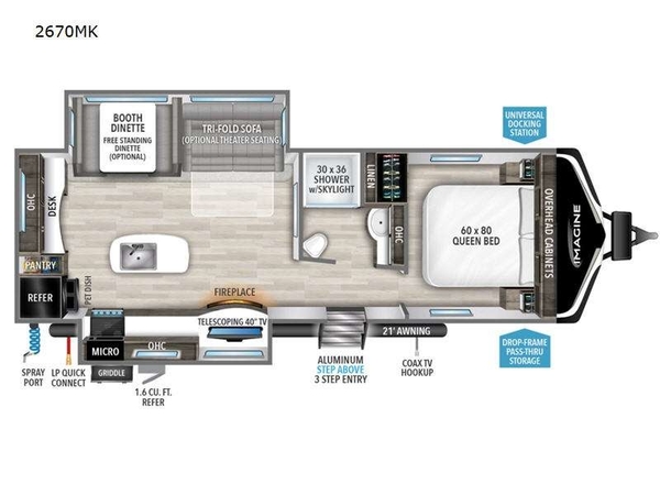 With this Imagine travel trailer, you can work while you're on the road because it offers you a desk in the main living area. You won't have to miss out on the action since you'll be right next to the booth dinette and tri-fold sofa, and there is even a pantry directly to the left of the desk for you to grab a quick snack while you're working. Once you're done with work, you can relax on the tri-fold sofa while you watch the telescoping 40" LED HDTV, and the private bedroom offers you a 60" x 80" queen bed to rest on when you're ready to call it a night.