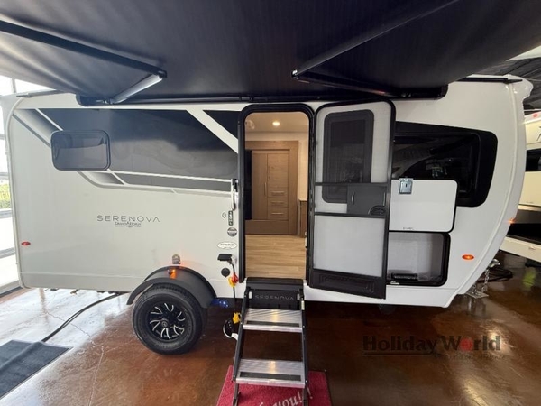 With any Serenova travel trailer by Grand Design, you will enjoy a smooth tow and at-home comforts wherever you decide to roam. There is a MORryde independent suspension plus MORryde shock, Goodyear Endurance tires, and Dexter tow assist with an anti-lock braking system and sway control for optimal handling. To help extend your camping season, there is an enclosed underbelly, a dedicated heat source with Thermafoil, heated dump valves plus thermostatically controlled 12V heating pads. Inside, you'll love the look of the imported Italian cabinetry, and there is a Klipsch whole home Bluetooth speaker so you can listen to your favorite tunes at the campground!
