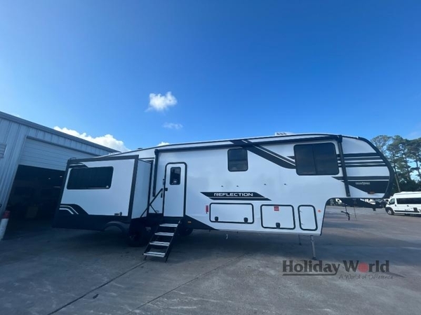 With any Reflection fifth wheel by Grand Design, you will have a solar panel for off-grid camping and a 60 amp charge controller and inverter prep, a Universal All-In-One docking station, unobstructed pass-through storage, and Goodyear Endurance tires. Each is constructed of gel coat exterior sidewalls, residential 5" truss rafters, walk-on roof decking, a fiberglass and radiant foil roof and front cap insulation plus laminated aluminum framed side walls, roof and end walls in slide rooms. Head inside to enjoy residential hardwood cabinet doors, premium Congoleum flooring, a spacious shower with a glass door, and many more comforts!
