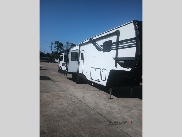 You can enjoy a spacious rear living area in this RV with dual opposing slides offering you entertainment, kitchen amenities, seating and windows for great views! The rear tri-fold sofa also converts into extra sleeping space for an extra guest or two, just like the booth dinette does. Yet you might like to add the swivel dinette option. There are theater seats to enjoy while you place your drinks in the cupholders and watch the entertainment center with a 40" LED HDTV and fireplace. The pantry is big enough to store your favorite snacks, and the kitchen island will make meal prepping easier, plus there is a 16 cu. ft. refrigerator to store any leftovers. The full bathroom has a 30" x 48" fiberglass shower and a linen closet to store your towels. The front private bedroom has a comfortable queen bed slide that can be switched out for the optional king bed, a dresser with overhead cabinets, and a full wall wardrobe that is prepped to add the optional washer and dryer so that you can extend your camping trip with clean clothes!