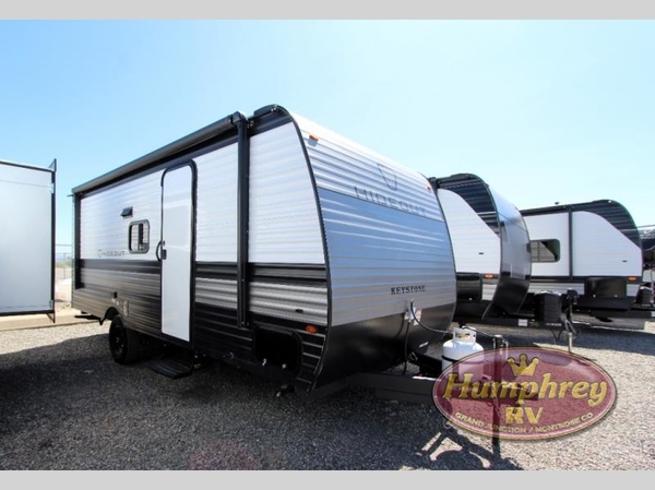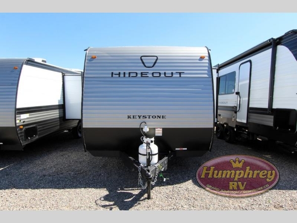 With any Hideout Mini travel trailer by Keystone, you will enjoy lightweight towing thanks to their single-axle! The AlphaPly TPO roof membrane is ultra durable, and the power awning will provide protection from the sun as you relax in your camp chairs outside. Each model includes blackout night shades, LED lighting, plus many more interior comforts. There is also a roof A/C and 20K BTU furnace to keep you comfortable, plus a tankless water heater for endless hot showers!