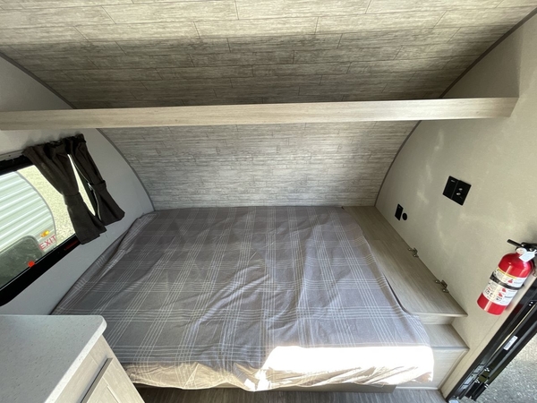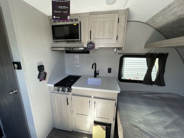 This lightweight travel trailer includes everything you need for comfortable camping trips at the lake. You can make your meals on the two burner cooktop or in the stainless steel microwave, and a 3.3 cu. ft. 12V refrigerator will keep leftovers fresh. A front queen bed provides a great night's rest, and there is a 29" booth dinette that will double as both dining and additional sleeping space. And a private bath with a 24" x 32" shower and toilet will let you easily freshen up without having to use the camp's facilities!