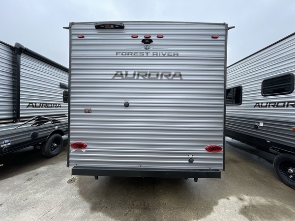 Comfortability, usability, and quality is what you will find in each one of these Forest River Aurora Light travel trailers! They are designed with a superior build and packed full with industry leading, functional, and distinctive standard features. SolidStep entrance steps and a Safe-T rail door assist on main entry door to help you safely enter and exit the unit. The diamond plate rock guard will protect your unit from road debris and the nitrogen filled radial tires, which keep their pressure longer, offer better fuel economy. You will also find upgraded JBL Elite exterior speaker outside, an electric awning with multicolor lights and remote, plus flush mount baggage doors for easy packing. The interiors are beautifully designed with matte black kitchen and bath faucets, black nightshades in the living room, and GE kitchen appliances!