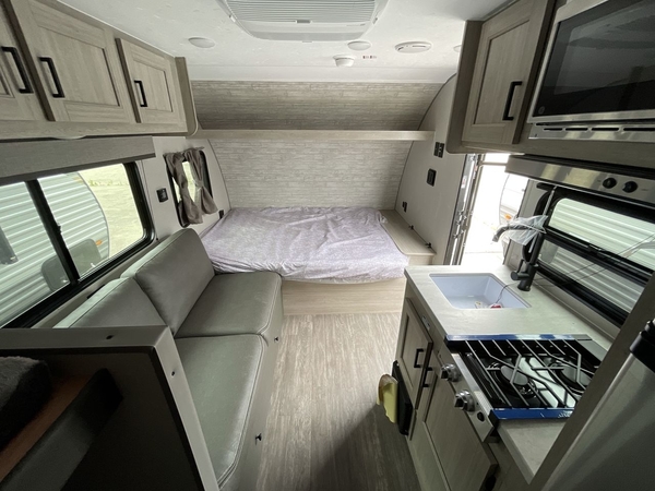 This cozy travel trailer can sleep five, so pack up and head out! You will have a queen bed up front to sleep on each night instead of an air mattress, and the little ones can take the 28" x 70" bunk beds! There is also a 60" sofa here that can sleep an additional guest and is perfect for relaxing during the day. The two burner cooktop and microwave oven means you won't have to cook over a campfire, and the private toilet and shower lets you clean up after a day outdoors. This model includes plenty of storage space, including bedroom storage, an exterior pass-through, plus additional outside storage beneath the bunks for hiking gear!