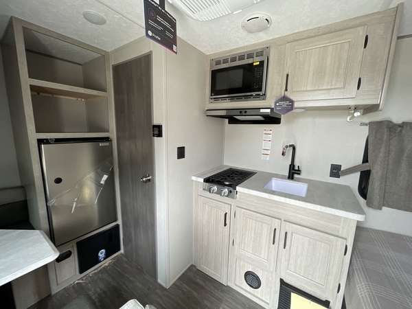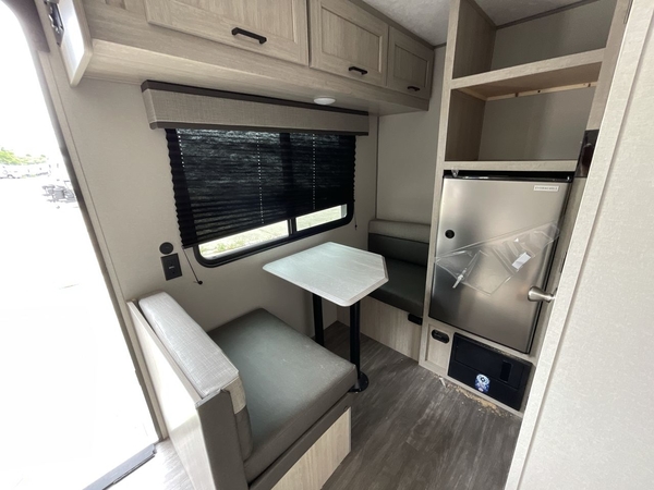 This lightweight travel trailer includes everything you need for comfortable camping trips at the lake. You can make your meals on the two burner cooktop or in the stainless steel microwave, and a 3.3 cu. ft. 12V refrigerator will keep leftovers fresh. A front queen bed provides a great night's rest, and there is a 29" booth dinette that will double as both dining and additional sleeping space. And a private bath with a 24" x 32" shower and toilet will let you easily freshen up without having to use the camp's facilities!
