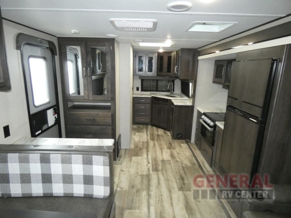 Relaxing weekends to the lake just got sweeter in this spacious travel trailer. Prepare lunch on the three-burner cooktop, and you can enjoy it at the booth dinette.This model includes plenty of storage space, including a pantry/wardrobe just as you enter the unit, overhead compartments, and even a pet drawer for food and water!