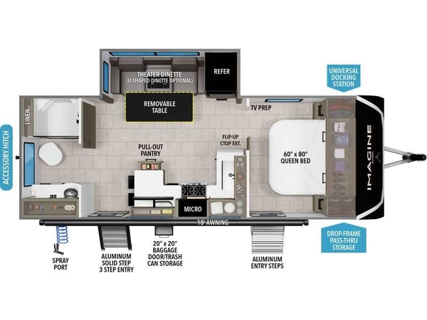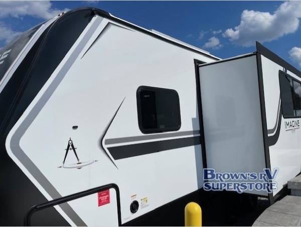 Just imagine leaving the world behind and secluding yourself away with your favorite people in your Grand Design Imagine travel trailer! The Imagine has been designed to enjoy extended season camping and includes a high-capacity furnace, a heated and enclosed underbelly with suspended tanks, a designated heat duct to the subfloor, and a high-density roof insulation with attic vent. You'll have maximum head room on the interior with 81" radius ceilings, and large panoramic windows to let in natural lighting. The exclusive drop-frame pass-through storage compartment is going to allow you to bring along lots of equipment, and the universal docking station is an all-in-one location for utilities and hook-ups. You'll also have oversized tank capacities so that you can fill and empty your tanks less often.