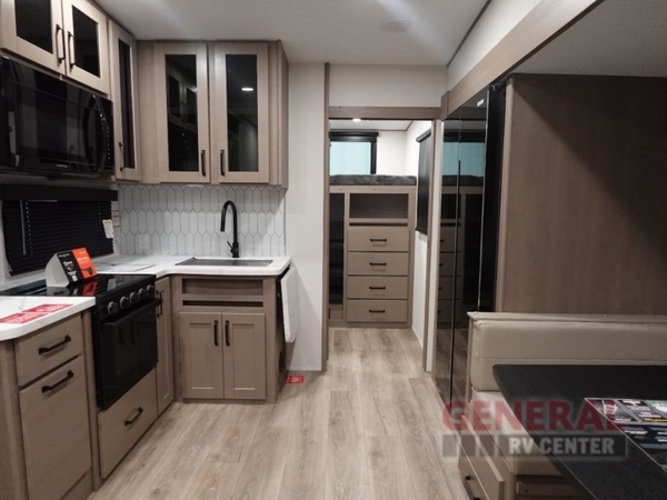 The whole family will enjoy camping in this fifth wheel! The kiddos will love having their own privacy with the rear private bunkhouse that has a 30" top bunk above a set of drawers, a 34" top bunk above a 48" lower bunk, and a TV prep area. You will enjoy having your own private retreat too with a front private bedroom that has a queen bed for a good night's rest and a wardrobe for your hang up clothes. The chef will have an easy time preparing their best dishes with the three burner cooktop and flip-up countertop or they can breathe in some fresh air while they cook at the outside kitchen with a griddle and 1.6 cu. ft. refrigerator for a cold beverage!