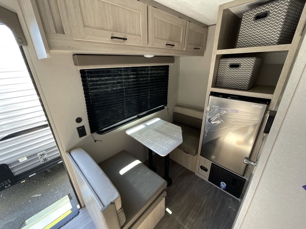 This lightweight travel trailer includes everything you need for comfortable camping trips at the lake. You can make your meals on the two burner cooktop or in the stainless steel microwave, and a 3.3 cu. ft. 12V refrigerator will keep leftovers fresh. A front queen bed provides a great night's rest, and there is a 29" booth dinette that will double as both dining and additional sleeping space. And a private bath with a 24" x 32" shower and toilet will let you easily freshen up without having to use the camp's facilities!