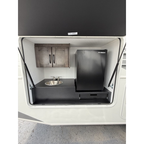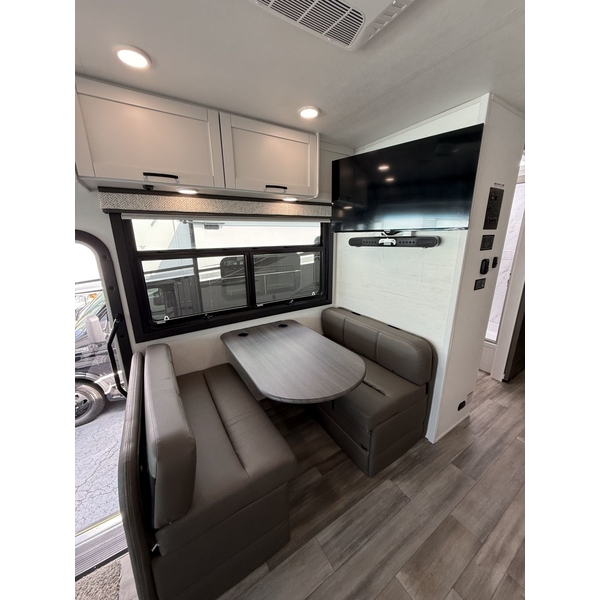 Inside, theres plenty to love. The Jayco-exclusive, easy-operation legless dinette table is built strong so it wont sag during meals or game night. It also quickly converts into a bed for extra sleeping space. Seatbelts in every seating position and child safety tethers in the dinette keep everyone safe during travel. In the kitchen, the residential-size microwave lets you cook your favorite meals from home, even while youre on the road.