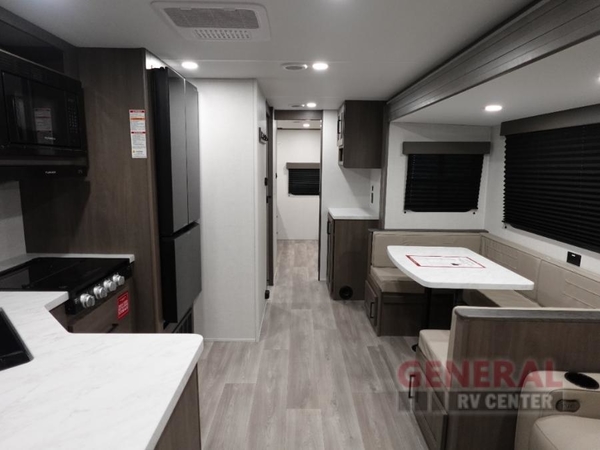 If you're looking for a travel trailer that can house your whole gang, this unit is the one! The rear private bunkhouse can sleep guests since there are three bunks, plus there are storage drawers for your guests' things. A front private bedroom will be perfect for the owners with a queen bed, storage space, and a convenient laundry chute! Whether you cook outside on the exterior griddle or inside on the three burner range, you'll be able to make your best meals. There is also a 12V French door refrigerator with a glass front and bottom freezer and a convection microwave/combo air fryer for easy meals! A U-shaped dinette and theater seats within the living room slide provides even more seating and sleeping space.