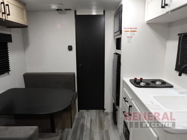 This travel trailer includes everything you need for fun trips at the lake. When you arrive at the campground, you can unload the exterior storage, then put out the 10' power awning. The booth dinette inside will provide a place to dine together, and the full rear bath with a shower will make it easier than ever to clean up after a day of hiking. A front RV queen bed will provide a great night's rest, and the overhead shelf will be perfect for books or personal belongings.