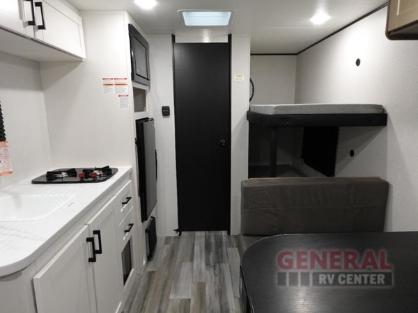 Your crew of five will love camping in this single-axle travel trailer! There are bunk beds in the rear corner and a full bath in the other rear corner for easy nighttime use. You will have the front queen bed to yourselves, along with an overhead shelf and a nightstand/wardrobe for your clothes. The booth dinette provides a place to dine, play games, and even let an extra guest stay over. The Customer Value Package on this Sport Edition model includes a 19K BTU furnace, stabilizer jacks, a power awning, an entry door with a window and shade prep, and many more stand-out features!