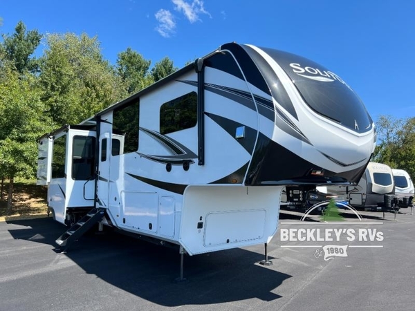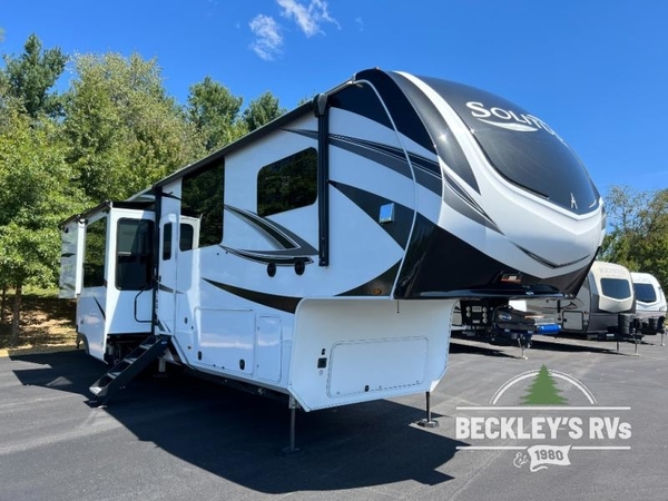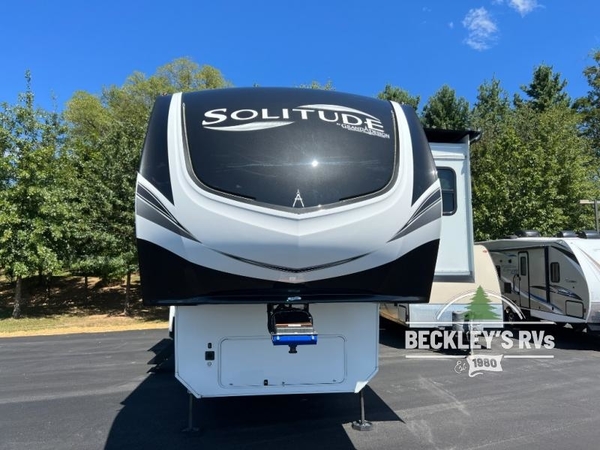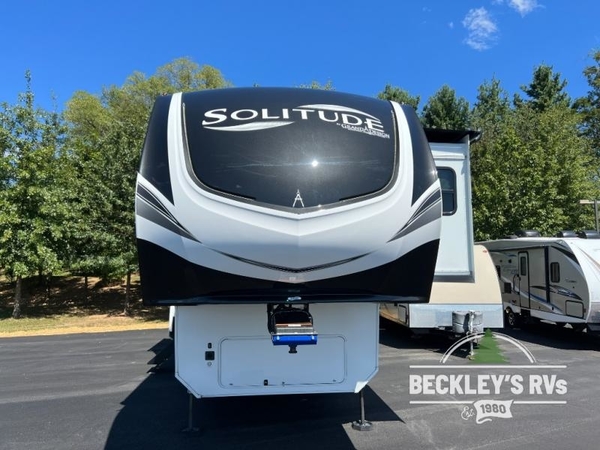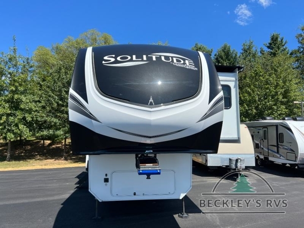 Each Solitude fifth wheel by Grand Design features a 101" wide-body construction, heavy duty 7,000 lb. axles, frameless tinted windows, and high-gloss gel coat sidewalls. You can camp year around thanks to the Weather-Tek Package that includes a 35K BTU high-capacity furnace, an all-in-one enclosed and heated utility center, and a fully enclosed underbelly with heated tanks and storage. Inside, you'll love the premium roller shades, hardwood cabinet doors, solid surface countertops and sinks, plus residential finishes throughout to make you truly feel at home. Each model also includes a MORryde CRE3000 suspension system, self adjusting brakes, and a MORryde pin box that will provide smooth towing from home to campground. Affordable luxury is possible with the Solitude fifth wheels; choose yours today!