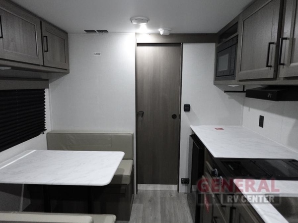 This is the perfect couple's trailer with versatile seating and sleeping space! You'll find a queen-size Murphy bed up front with storage space beside and above plus a full rear bath for added privacy. Once you've made lunch in the full kitchen, you can dine at the booth dinette, or take your plate outdoors to sit under the 10' power awning. You'll also find an unobstructed pass-thru storage outside that will be perfect for fishing poles, lawn chairs, tools and more!