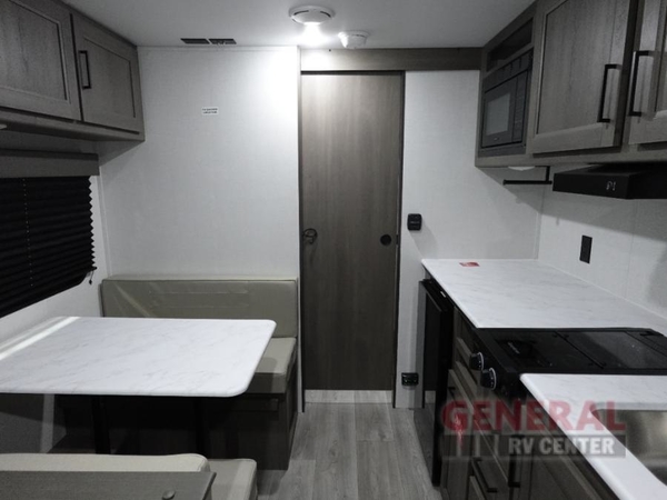 This is the perfect couple's trailer with versatile seating and sleeping space! You'll find a queen-size Murphy bed up front with storage space beside and above plus a full rear bath for added privacy. Once you've made lunch in the full kitchen, you can dine at the booth dinette, or take your plate outdoors to sit under the 10' power awning. You'll also find an unobstructed pass-thru storage outside that will be perfect for fishing poles, lawn chairs, tools and more!
