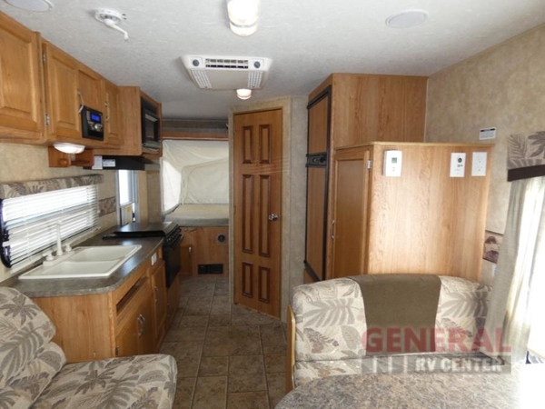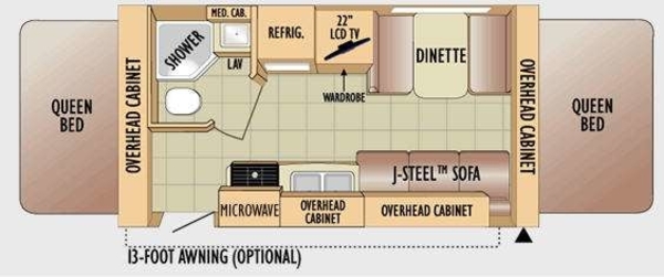 Jay Feather EXP Travel Trailer Expandable by Jayco, Front & Rear Queen Tent End Beds, Angle Shower, Lav. w/Med. Cab., Refrig., Ward./TV Shelf, Booth Dinette, Overhead Cabinet, 22" LCD TV, J-Steel Sofa, Dbl. Kitchen Sink, 3 Burner Range and more!