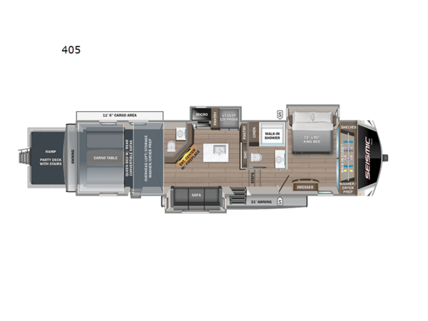 One look at the Seismic toy haulers by Jayco, and you'll never go back! Each model features a custom automotive-grade vinyl exterior graphics package, a painted fiberglass front cap with built-in LED lighting, and 102" wide-body structural steel I-beam construction. You'll find the pass-through storage with Slam-Latch baggage doors will make unpacking easier than ever, and the rear ramp door/patio with anti-slip, non-skid flooring will allow you to unload your toys with no trouble at all. These toy haulers feature a three seasons garage wall/doors, a 30 gallon fuel tank with a timer, and exterior marine-grade speakers to keep the party going. The Climate Shield zero degree tested weather protection includes a 35,000 BTU furnace, PEX plumbing, and a fully enclosed and heated underbelly so you can enjoy your adventures year around. And we haven't even touched on the interior luxuries you'll find, like solid hardwood cabinet doors, residential vinyl flooring made in the USA, night shades, and more!