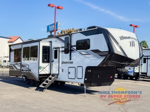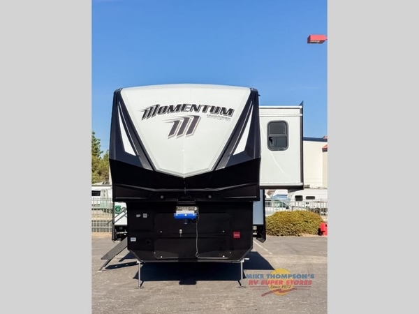 With any Momentum M-Class toy hauler by Grand Design, you will enjoy luxury at every turn! They have been constructed to a superior standard with a thermal roof design, triple insulated main floor and garage floor, and a Rail-Tite underbelly seal that will allow you to camp in all elements. Each model also features an 8' 5" wide body chassis with a wide rail design, no wheel wheels, and a dovetail entry for easier loading. The Stealth A/C system provides maximum cooling power, and the CRE3000 suspension system means you can enjoy a smooth tow each time. You will love the luxurious interior with a professional grade stainless steel cooktop, interior color changing LED accent lighting, a fiberglass shower with a glass door, and solid surface countertops.