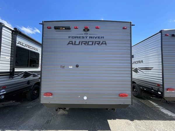 Comfortability, usability, and quality is what you will find in each one of these Forest River Aurora Light travel trailers! They are designed with a superior build and packed full with industry leading, functional, and distinctive standard features. The diamond plate rock guard will protect your unit from road debris and the nitrogen filled radial tires, which keep their pressure longer, offer better fuel economy. You will also find upgraded JBL Elite exterior speaker outside, an electric awning with multicolor lights and remote, plus flush mount baggage doors for easy packing. The interiors are beautifully designed with matte black kitchen and bath faucets, black nightshades in the living room, and GE kitchen appliances!